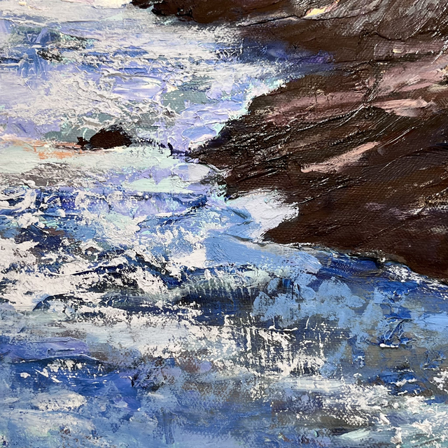 Cribba Head reflects the power and calm of the ocean, where steadfast cliffs rise against the relentless pull of the tides. Layers of oil capture movement and light, a balance between strength and surrender. Through the rugged rocks, soft light filters in, suggesting hope and beauty within life’s storms, a quiet reminder of endurance and grace.